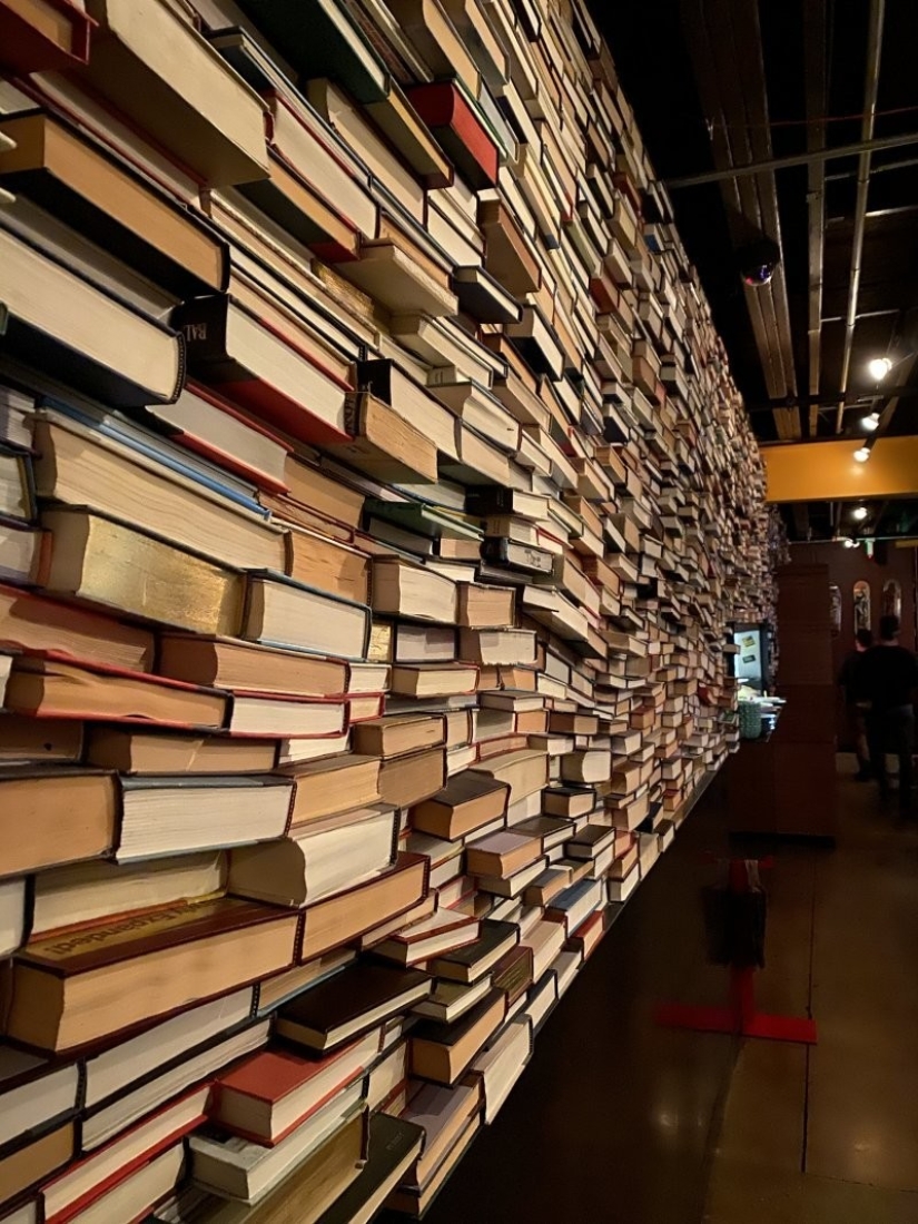 A wall in a public place made entirely of books