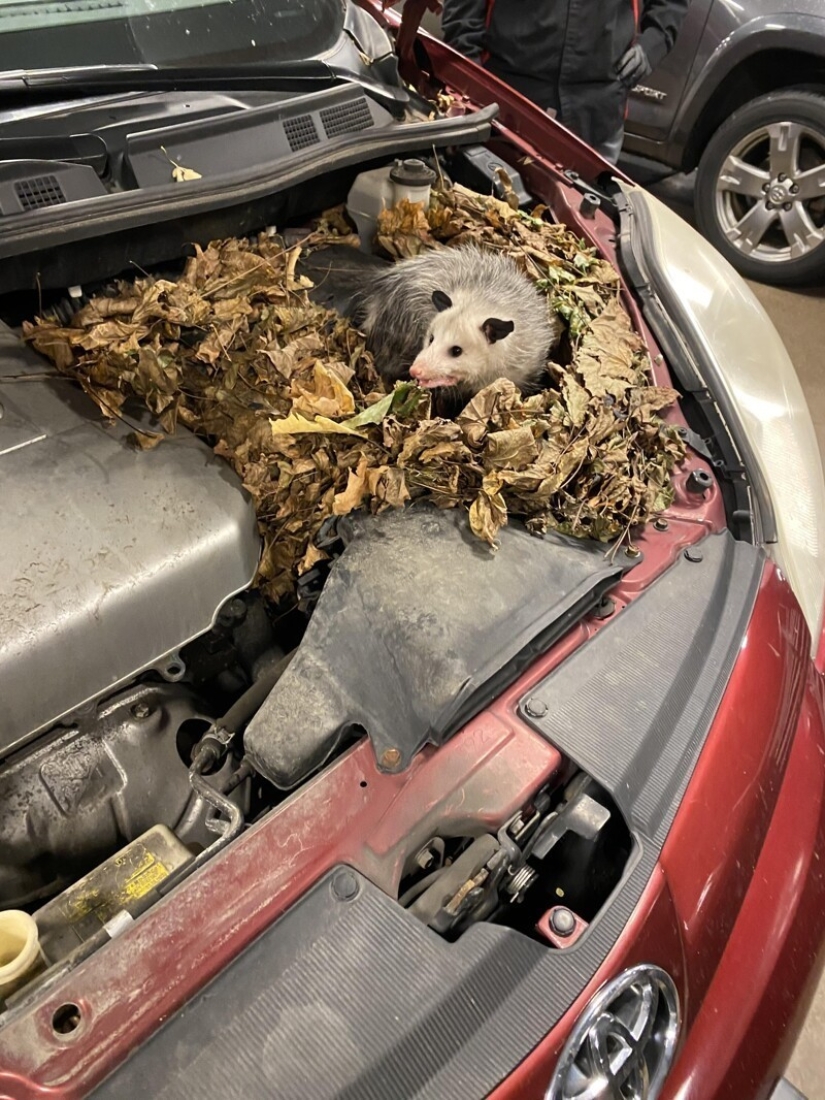 The car mechanic just opened the hood cover, and saw the new occupant of the car.