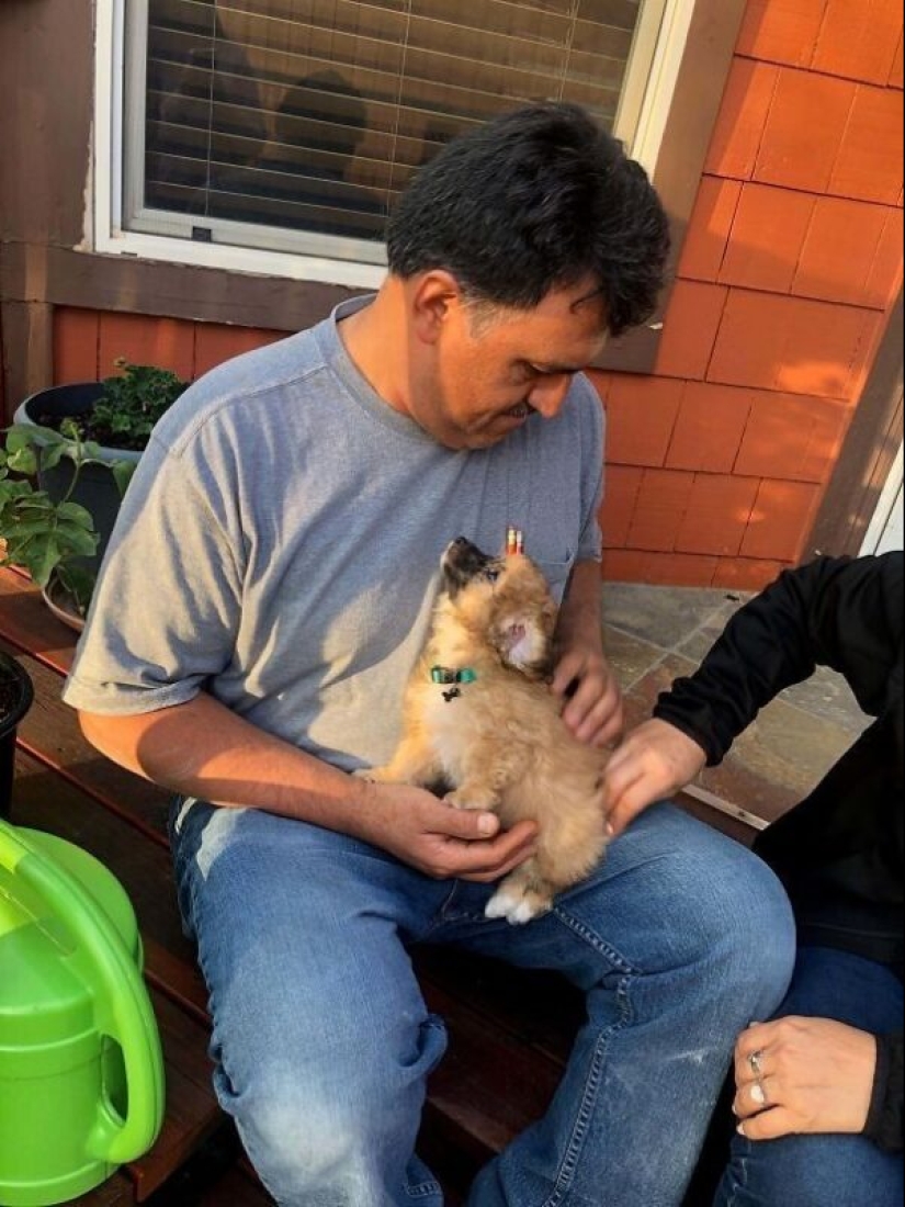 "Dad has long resisted that we get a dog. But today, my sister secretly took a puppy at the shelter. Here is their first meeting"