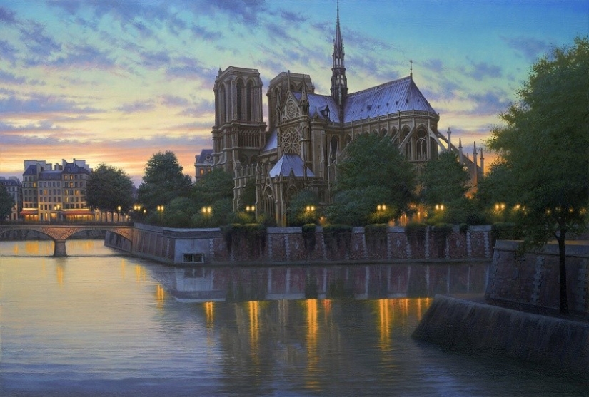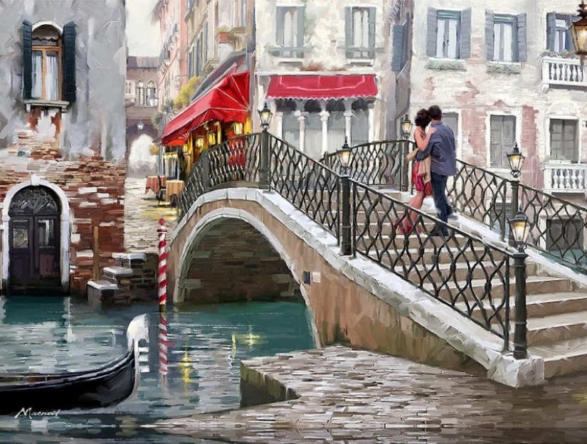 He was educated in the field of applied and decorative arts and works as an Illustrator in a Paris advertising agencies, but painting something like: the city of lovers — Paris, Venice, and cities of the East.