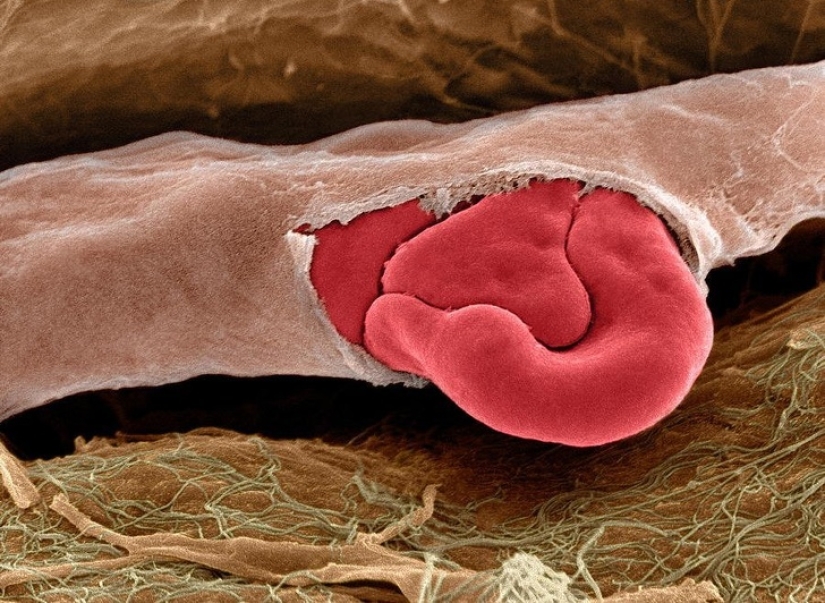 This is what a damaged capillary and red blood cell look like under a microscope.