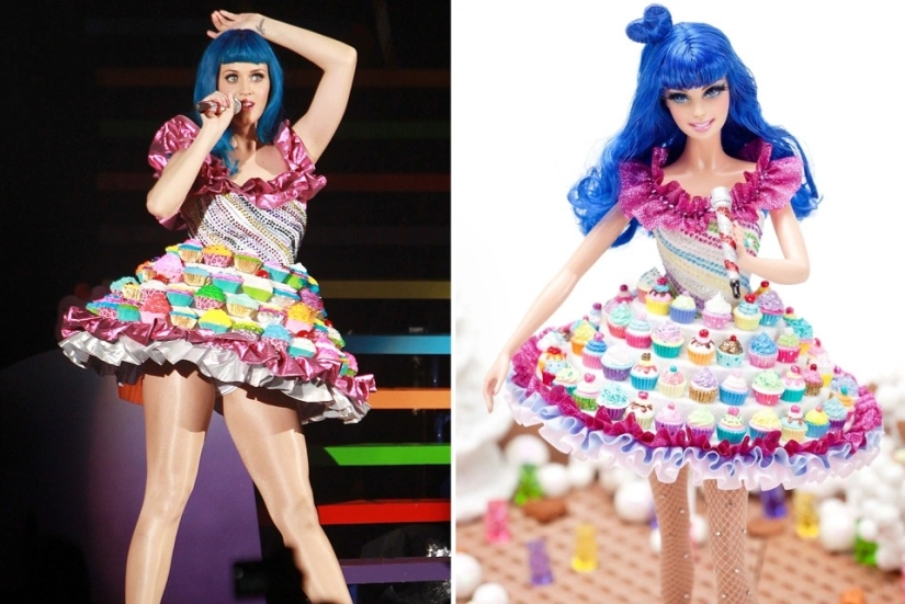 The bright costume of the singer became the basis of the most refined and detailed outfit for Barbie. It consists of 70 hand-painted mini cupcakes on the skirt, as well as fishnet stockings with Swarovski crystals. The creators even drew Barbie tattoos, like Katy Perry.
