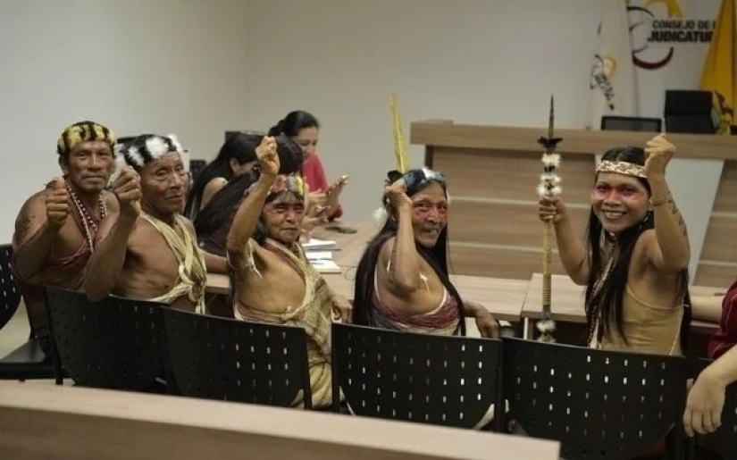 The Waorani people live in Ecuador. After lengthy litigation, they won a case against an oil company claiming their land. In the photo, members of the Amazon tribe in the courtroom