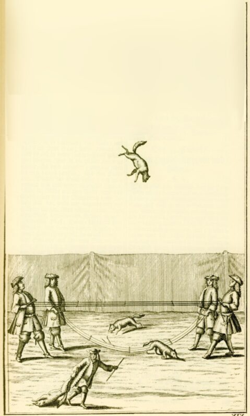 In addition to people, there are foxes on the field, but the strangest thing is that these animals also fly in the air above the field. The strange action is watched from behind the fence by the audience. There are such images in other books devoted to hunting and entertainment. What you see is called Fuchsprellen in German, or "fox throwing". This is an old and very cruel sport, which is described in the book "Hunting weapons from the Middle Ages to the 20th century".