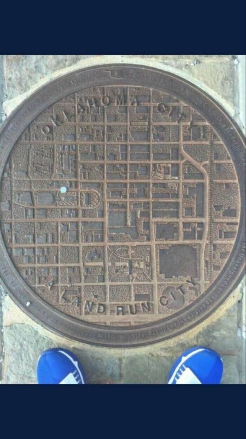 En las tapas de alcantarilla en Oklahoma, hay un mapa de la zona con un punto azul en el lugar donde se encuentra