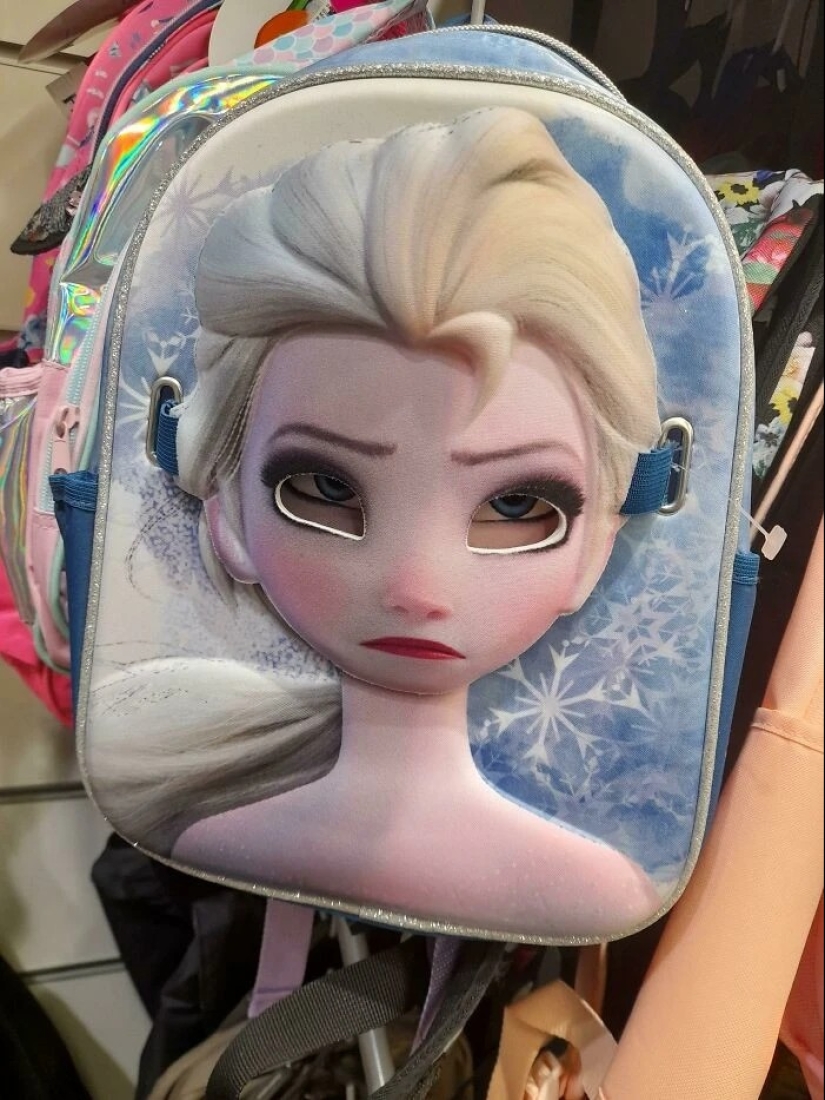 Una mochila para niños con una máscara de la Reina Elsa en el interior. Elsa vio lo que Hans vio