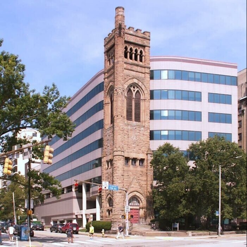"Esto es Pittsburgh. La antigua iglesia fue demolida, pero el campanario se quedó, y este edificio estaba atascado justo detrás de él»