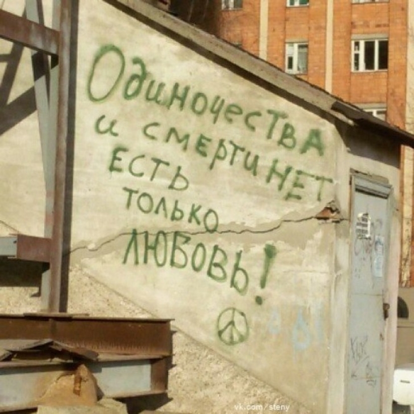 Y a veces, existe la sensación de que esta inscripción apareció aquí solo para ti, tanto que refleja el estado interno o responde claramente a la pregunta atormentadora. Mañana se puede pegar, pintar, demoler junto con la cerca, pero hoy es solo para ti. Después de todo, las paredes no solo escuchan, sino que también hablan. Escuchar...