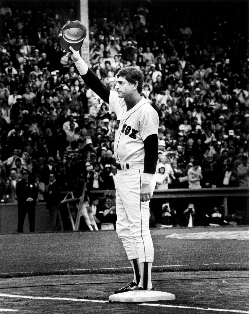 El legendario jugador de béisbol de Carl Yastrzhembsky saluda a los fans en el día de su jubilación.