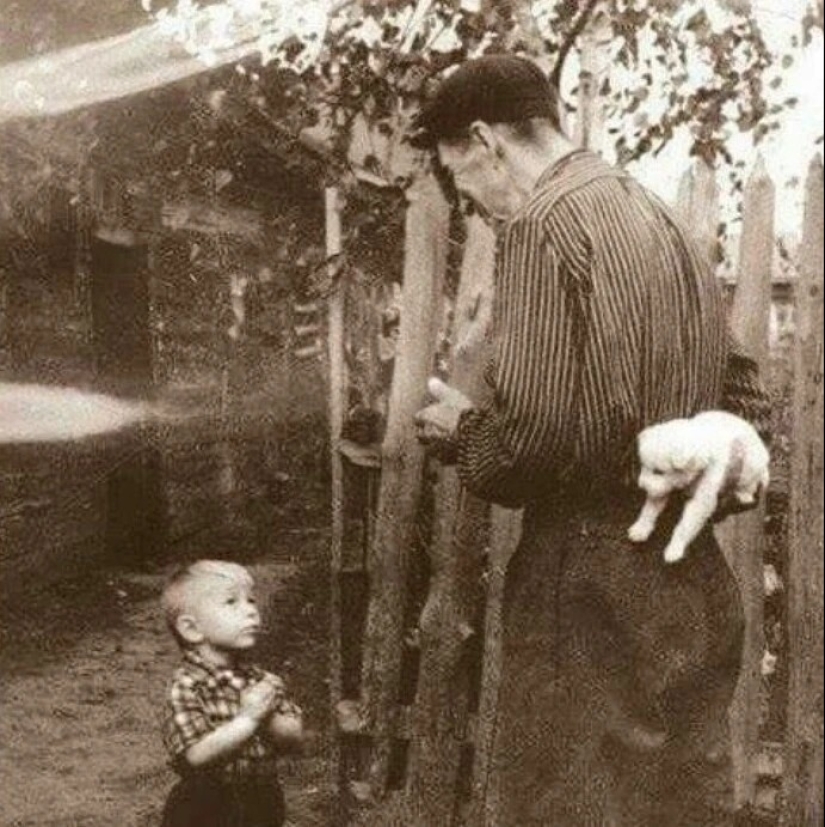 Un niño espera a que su padre le dé un regalo tan esperado, 1929