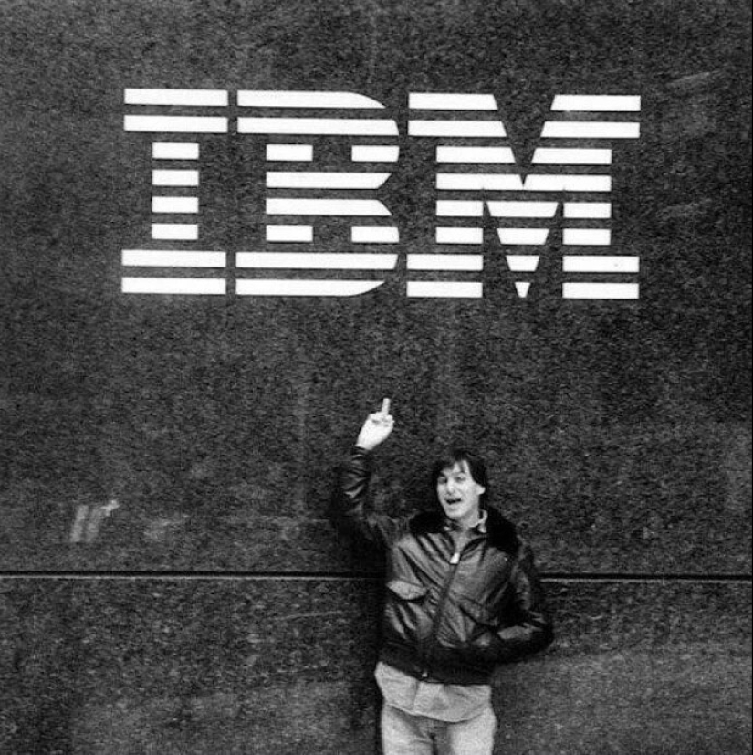 1983, Steve Jobs le da el dedo medio al logotipo de IBM (uno de los fabricantes más grandes del mundo de hardware, software y servicios de TI)