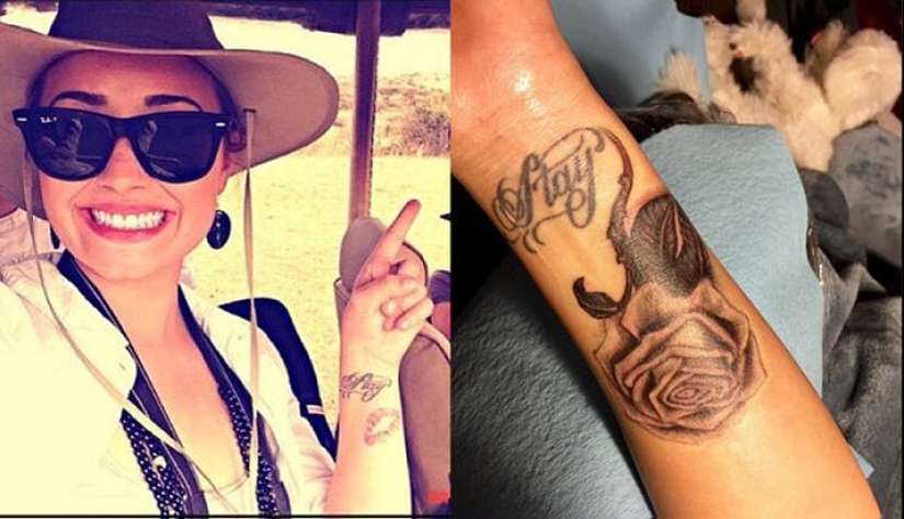 Pero la cantante demi Lovato fue aún más lejos! Alguna razón (no está claro por qué) la chica se tatuó en el brazo de la imagen de los labios de su pareja. Como sucede generalmente, después de algún tiempo, la pareja huyó. A continuación, las partes del cuerpo de los hombres en su muñeca se convirtió en una rosa.