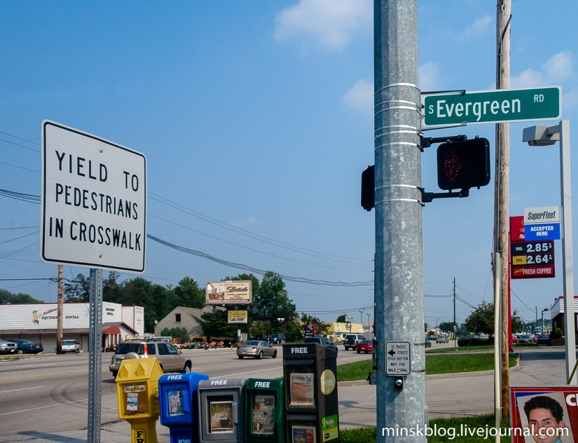 En EE.UU. prácticamente no existen señales de tráfico en el sentido habitual de la palabra. Casi todas las señales de tráfico están escritas con letras, de modo que cualquier idiota que domine el alfabeto latino puede entenderlas. No hay ladrillos, ni diamantes amarillos con bordes blancos, ni triángulos rojos: todo está escrito con palabras: "ceda el paso a los peatones", "límite de velocidad de 50 mph", "cruce de peatones", etc.