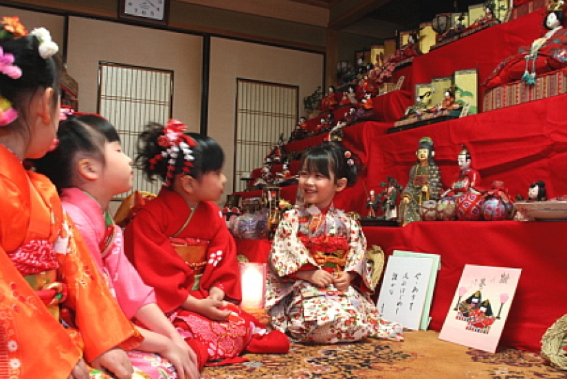 On this day, a girl dressed in a kimono with floral pattern, like real ladies, we go to each other's homes, give and receive gifts, eat special sweets: multicolor Hesi Moti, diamond Moti), cookies, hin arare (lush special sweets made of rice, covered with a sweet syrup), shirozake (sweet white sake, which is prepared by thorough mixing of malt rice, steamed rice, and strong vodka) and admire the dolls.