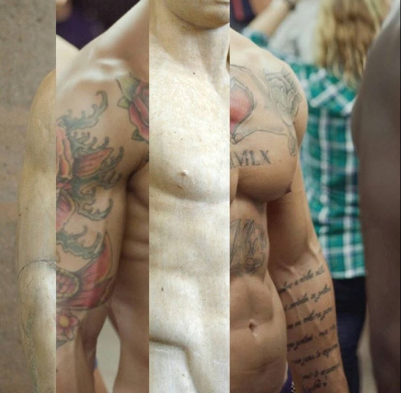 Pinoza has a subtle sense of the human body and a peculiar sense of humor. He combines beautiful images — for example, images of classical Greek sculpture or pictures from glossy magazines — with shocking shots almost from porn.