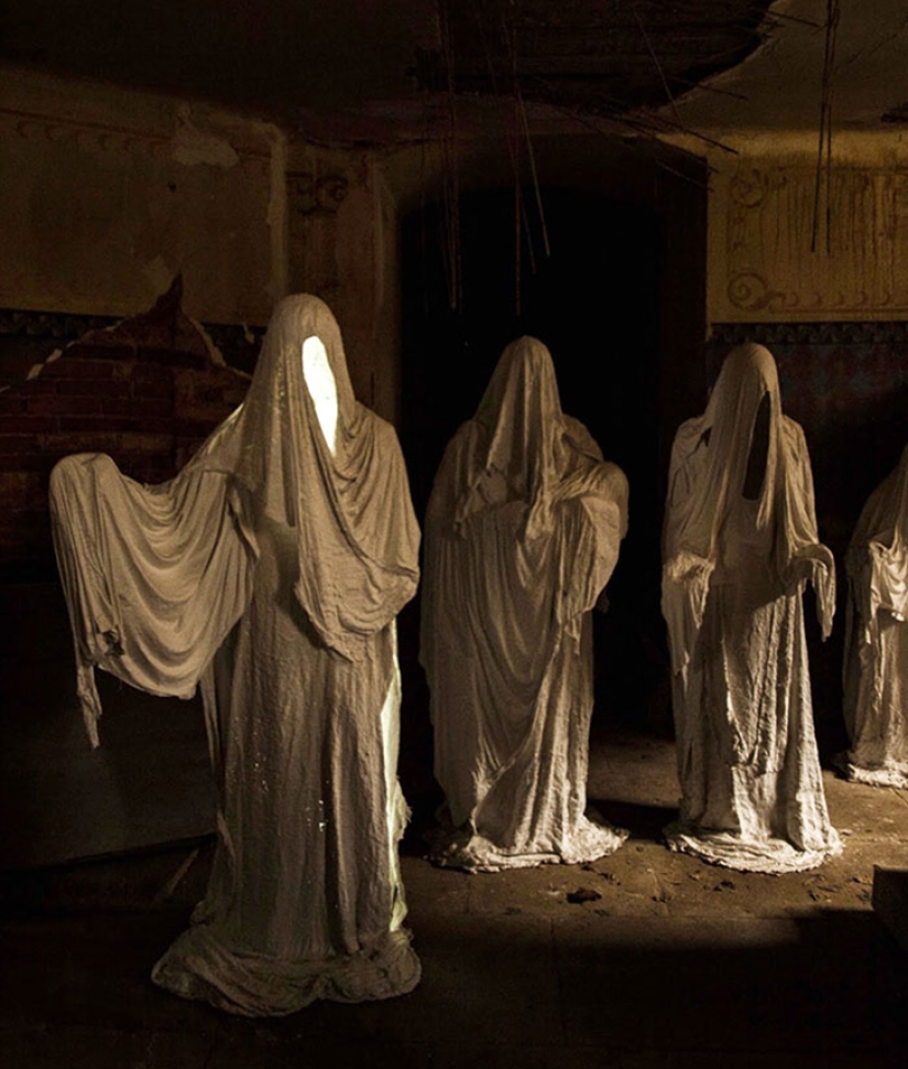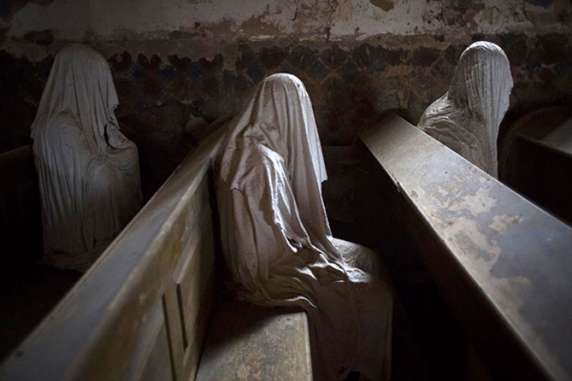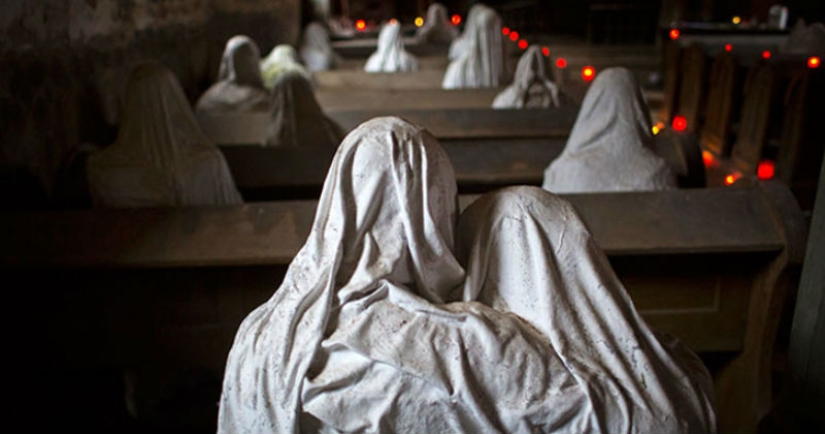 In an attempt to draw attention to the old historic building, local artist Jakub Hadrava turned the ruins into an art object. Now, silent, motionless white silhouettes sit on the pews for the congregation.