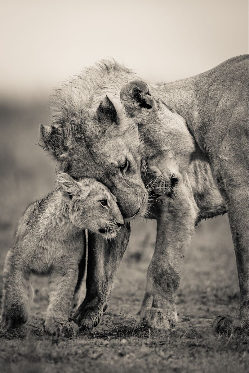 Dos leones adultos jóvenes pasan un momento tierno con uno de los cachorros de la tribu.