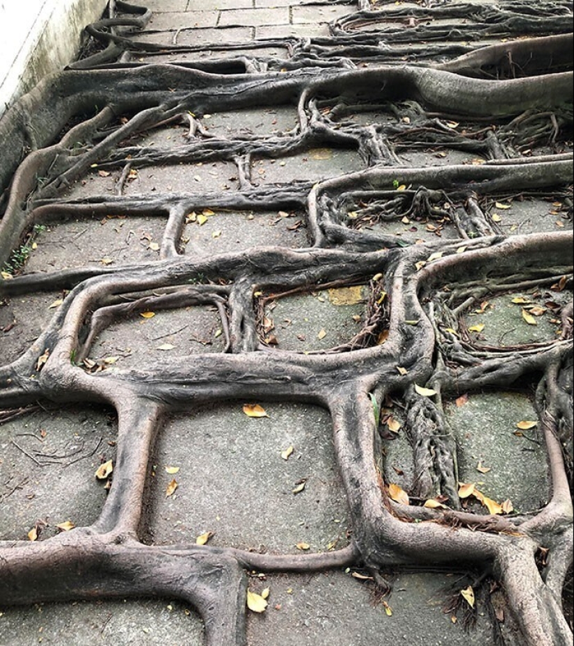 Las raíces crecen en conformidad con las grietas en las baldosas