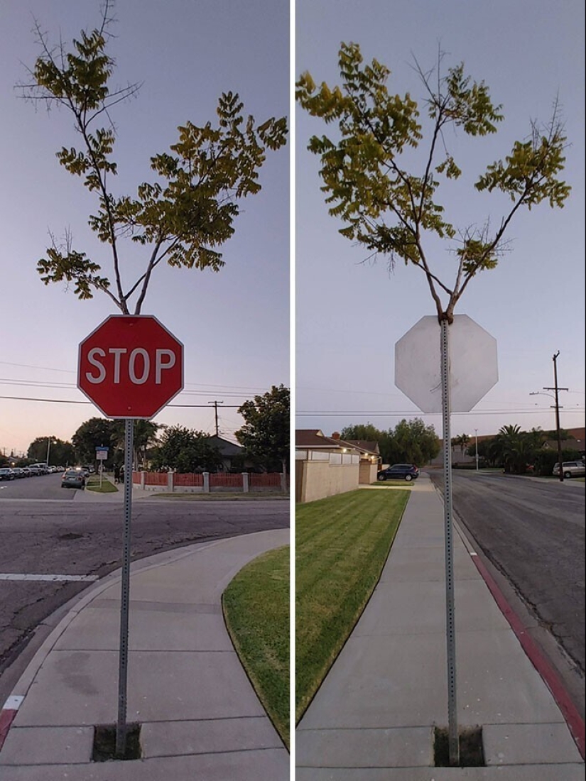 Árbol que crece alrededor de la señal en la ruta peatonal