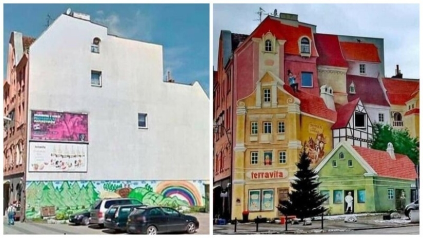 La pared del edificio antes y después de la impresionante pintura en el estilo de trampantojo (trampantojo, " engaño»)