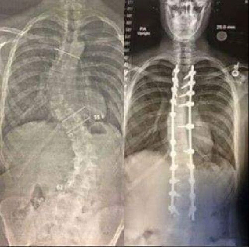 Radiografía de la espalda antes y después de la cirugía de alineación espinal debido a escoliosis