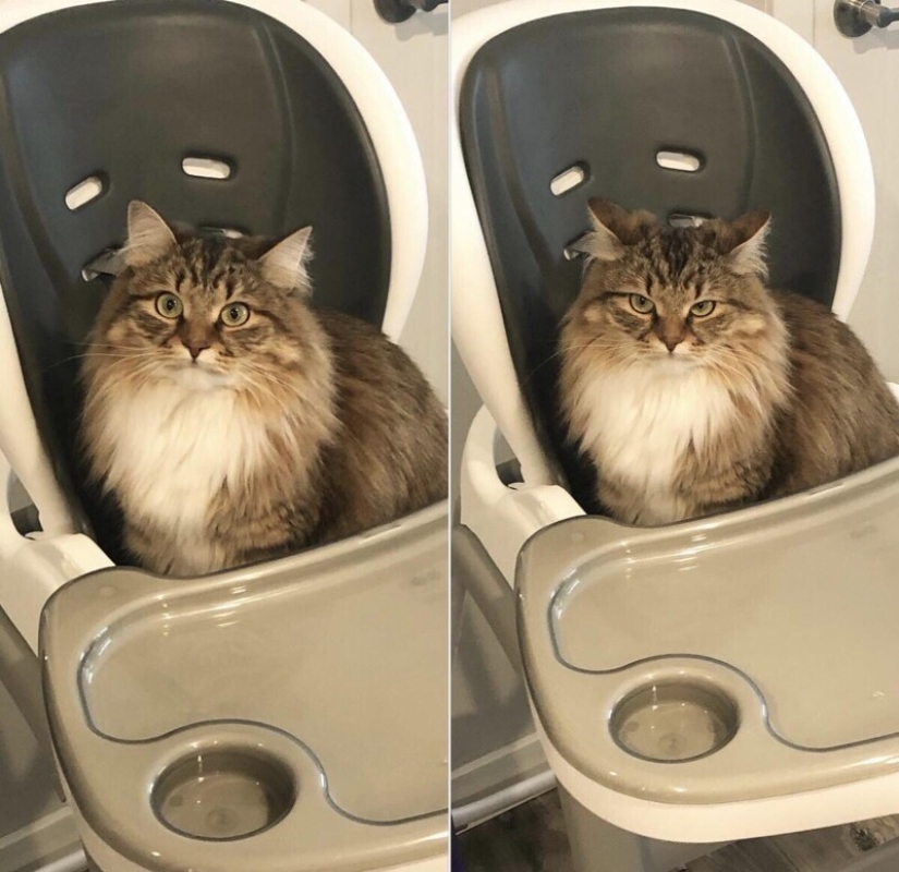 El gato antes y después de que le dijeran que esta silla no es para ella