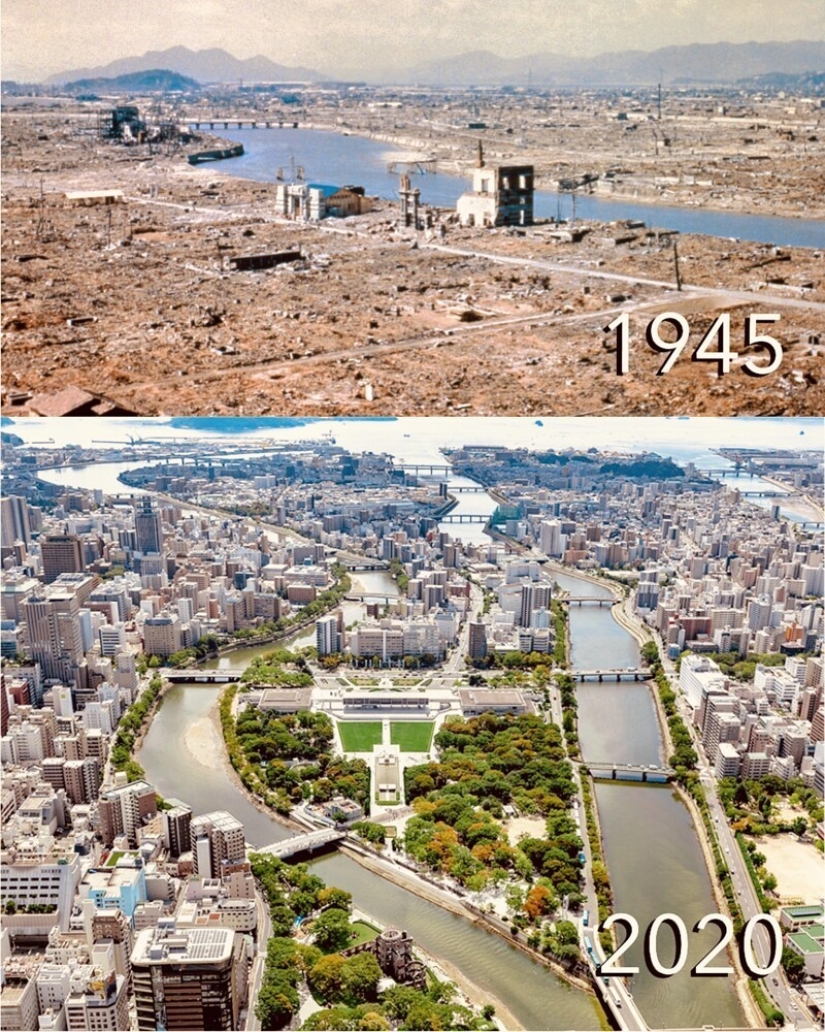 Hiroshima poco después de la explosión de la bomba atómica y 75 años después