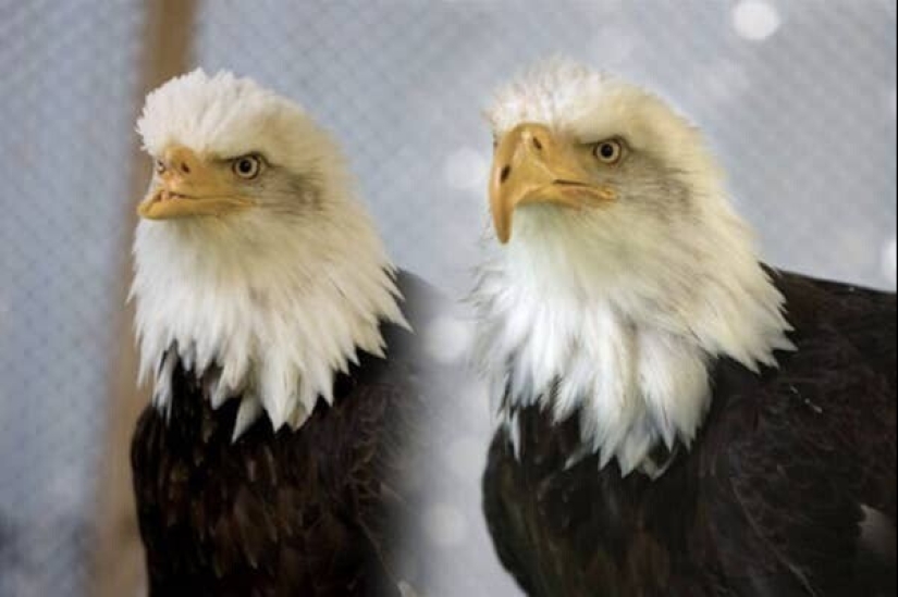 Águila calva cuyo pico fue disparado por un cazador furtivo, antes y después del pico protésico