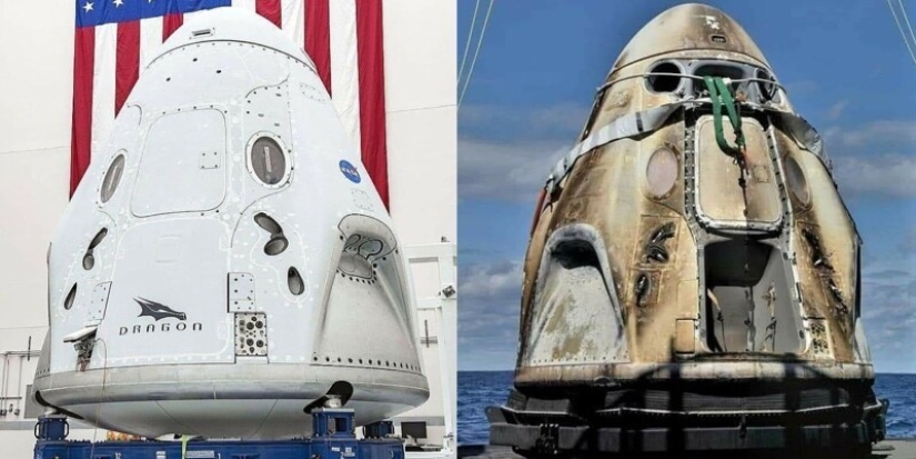 Nave espacial Crew Dragon Endeavour antes de la salida a la ISS y después del regreso