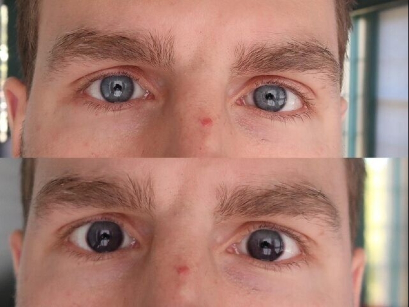 Un hombre antes y después de salir al sol con lentes de contacto que se adaptan a las condiciones de luz