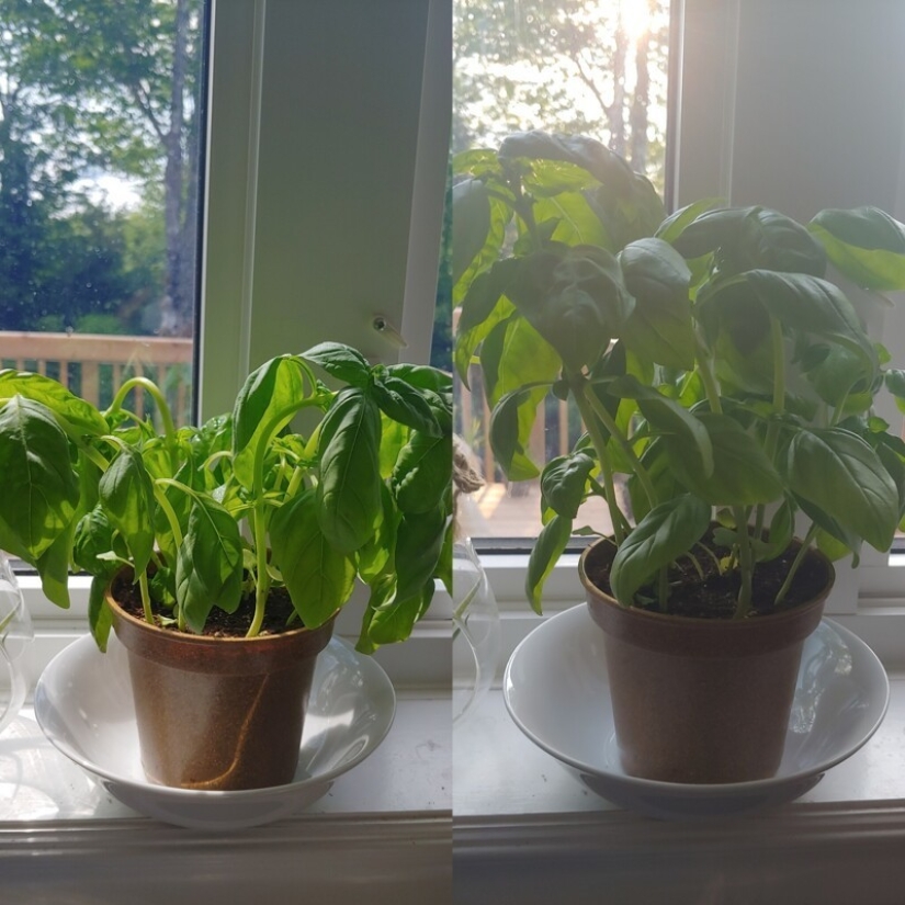 Albahaca antes y después del riego