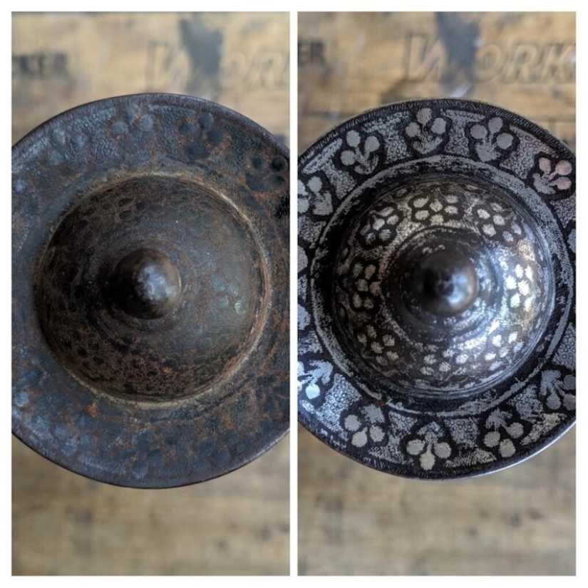 La empuñadura de una espada de 300 años antes y después de la limpieza