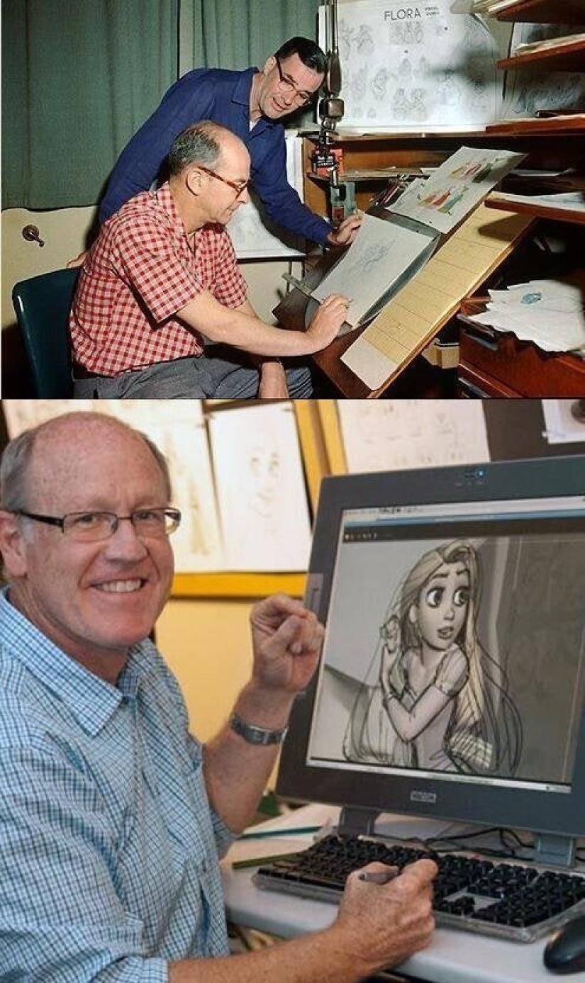 Animadores de Disney entonces (a finales de los años 50, trabajando en "Sleeping Beauty") y ahora (2010, trabajando en " Rapunzel»)