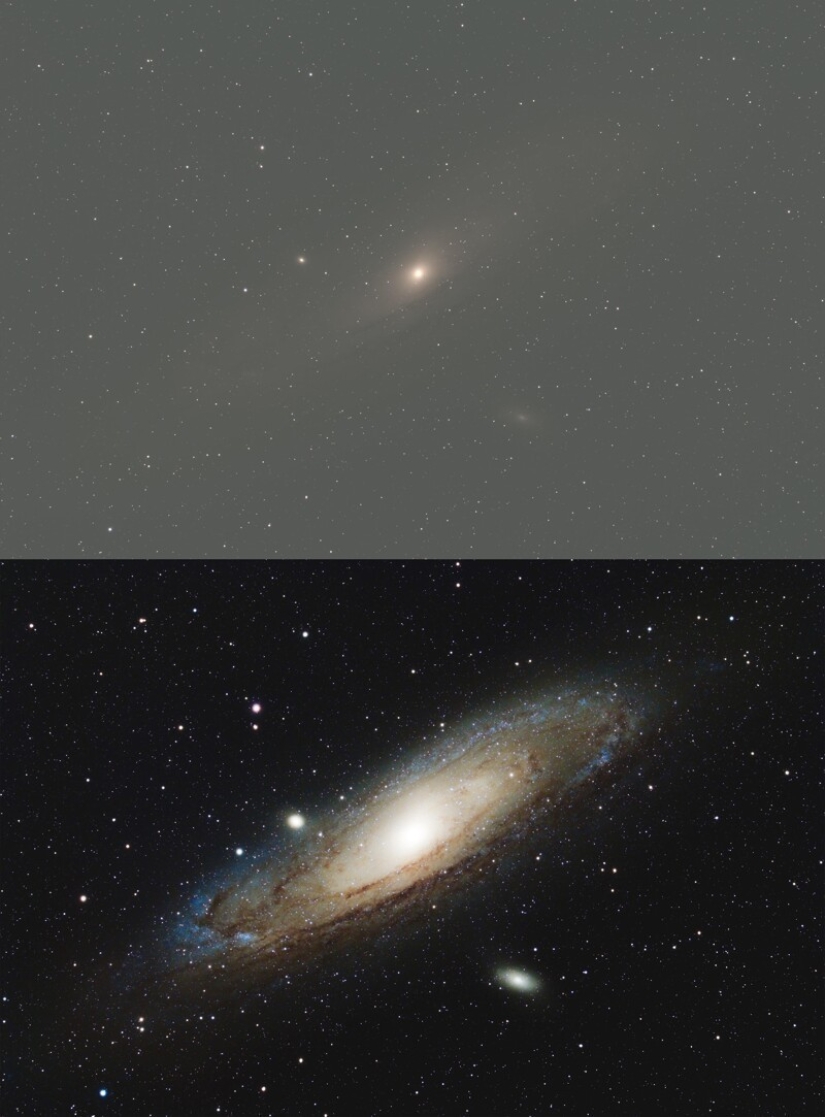 Foto de la Galaxia de Andrómeda antes y después del procesamiento