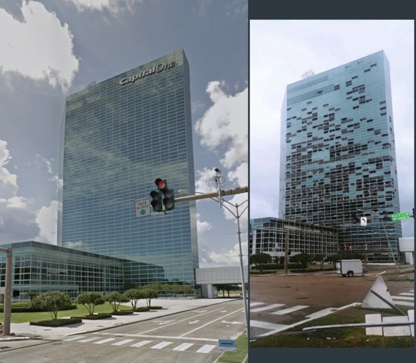 Ventanas de un "rascacielos" de varios pisos antes y después del huracán Laura. Lake Charles, Louisiana