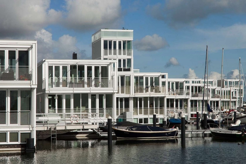 El asentamiento de Ajeyburg, situado cerca de la capital holandesa, se encuentra por debajo del nivel del mar, pero no está en peligro de inundación: el área ya es un embalse, y cada edificio en él es una especie de barco. Los holandeses crean casas en el agua debido a la falta de terrenos adecuados para la construcción, los edificios flotantes se construyen en astilleros holandeses, luego se remolcan a ubicaciones permanentes y se amarran a amarres especiales. Las casas están construidas sobre una base flotante de espuma de hormigón, están completamente selladas, por lo que el Ajayburg soporta perfectamente el aumento del nivel del agua.