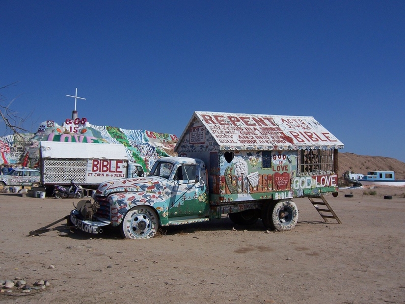 Los residentes de Slab City la llaman "la última ciudad libre de la Tierra", y los habitantes menos románticos de los asentamientos circundantes usan la "isla de la libertad" como un vertedero gigante para casas móviles antiguas, automóviles y otra basura voluminosa.