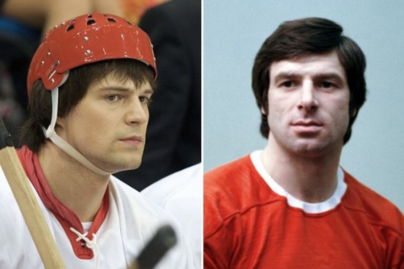 4. De izquierda a derecha: Danila Kozlovsky como Valery Kharlamov en la película "Legend No. 17"; jugador de hockey Valery Kharlamov.