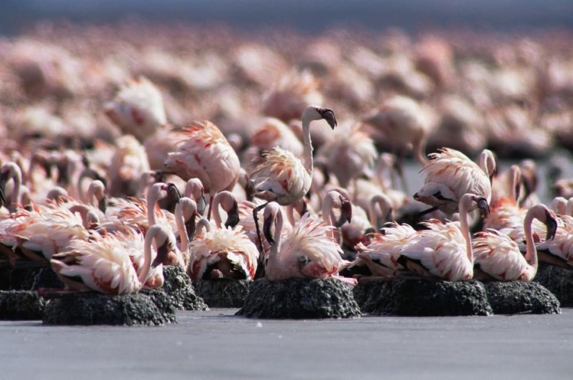 Las aguas del lago protegen confiablemente a los flamencos de los depredadores durante la temporada de apareamiento, por lo que millones de estas aves vienen aquí a anidar, pero esto sigue siendo un evento bastante peligroso: los flamencos construyen sus nidos en islas de sal que rodean las aguas mortales del lago.