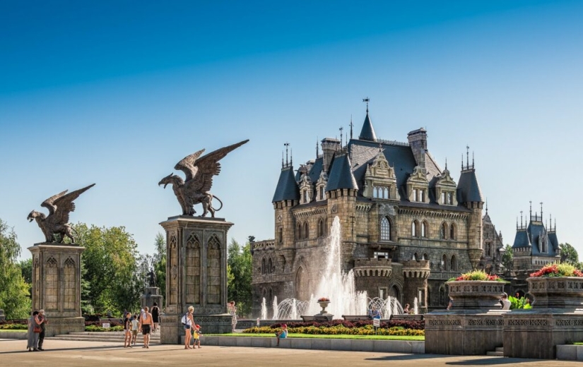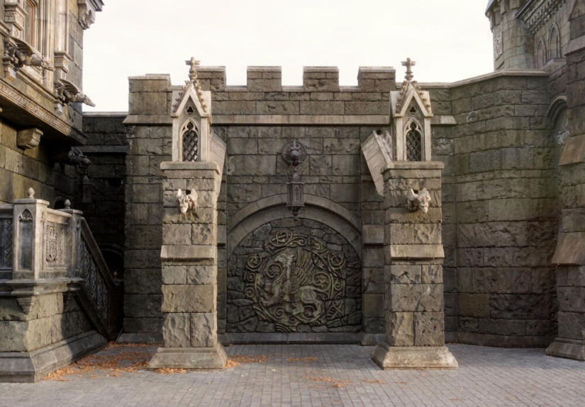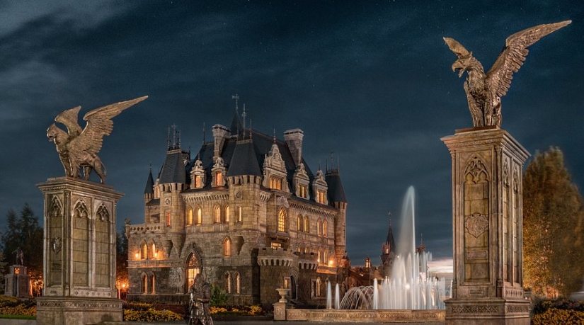 Entre el castillo y el edificio anexo hay una zona de ocio con fuentes, una piscina y un paseo de esculturas. El diseño artístico del complejo fue responsabilidad del famoso artista Sergei Karengin. Realizó esculturas, bajorrelieves y estucos, y también trabajó en la decoración de interiores, que pocos han visto todavía.