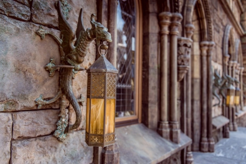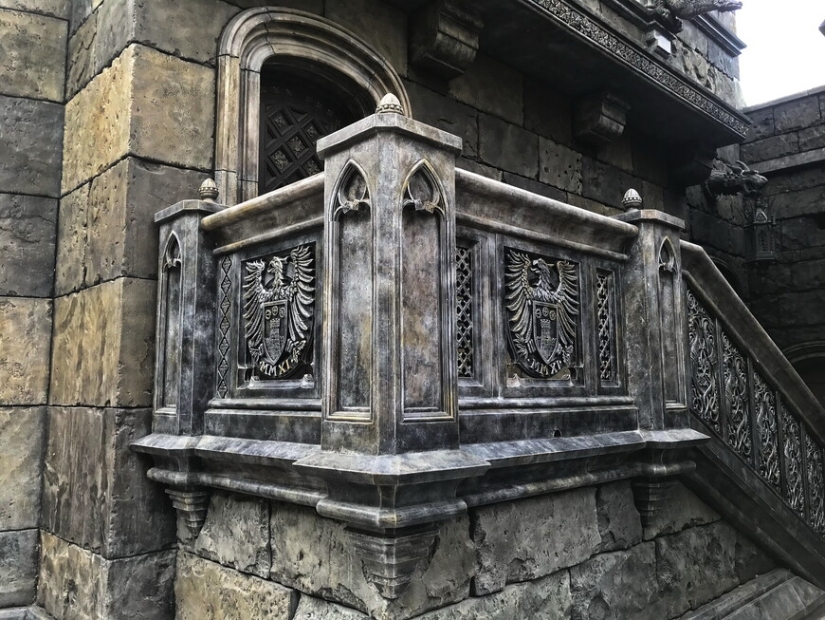El castillo se ve increíble desde el exterior. Es un edificio neogótico que combina elementos arquitectónicos de la Edad Media, el Renacimiento y la época victoriana. El castillo está decorado con torres con chapiteles, ventanas ojivales, bajorrelieves y gárgolas. Cerca hay un edificio anexo con cuartos de servicio, diseñado en el mismo estilo.