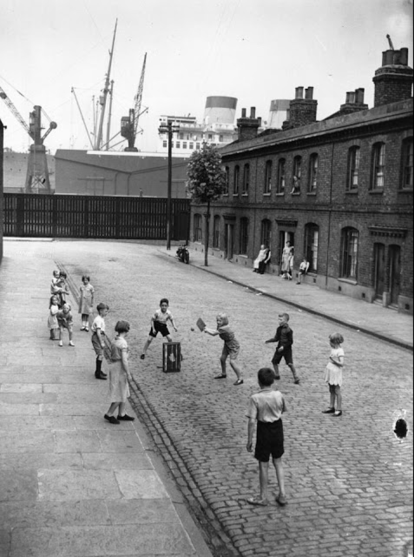 Los niños juegan cricket en Millwall Street. En el fondo es un forro en el Támesis, 1938.