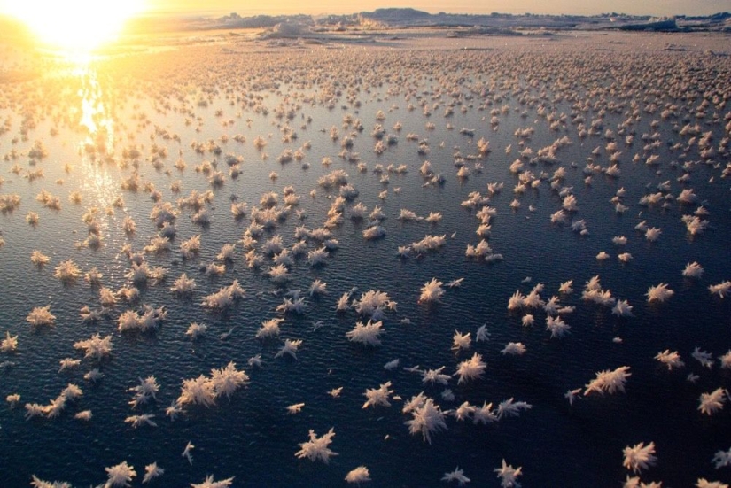 En las tranquilas aguas de los lagos y de los mares, cuando la superficie sólo ha captado una ligera costra de hielo en un fuerte frío encaje (sobre -22 C) provocar la formación de cristales de hielo fresco maravillosas formas.