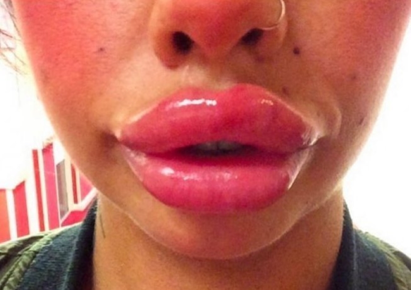 Algunas chicas en busca de la belleza han llegado al punto de lo absurdo, decorando una cara linda con tales "albóndigas". El resultado fue exactamente lo contrario. Resultó que la mayoría de los hombres consideran que las bellezas con labios enormes no son particularmente inteligentes. Desafortunadamente, no todas las chicas saben que las esponjas "bombeadas" ya no están de moda.