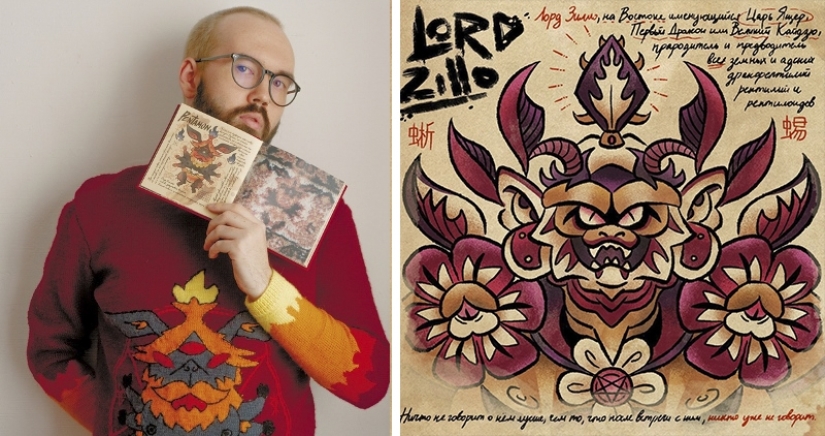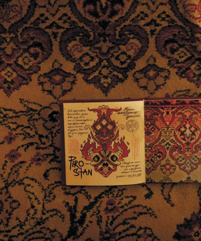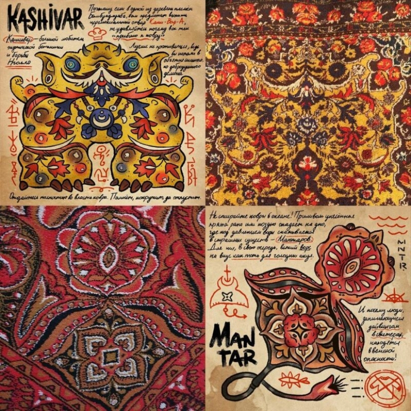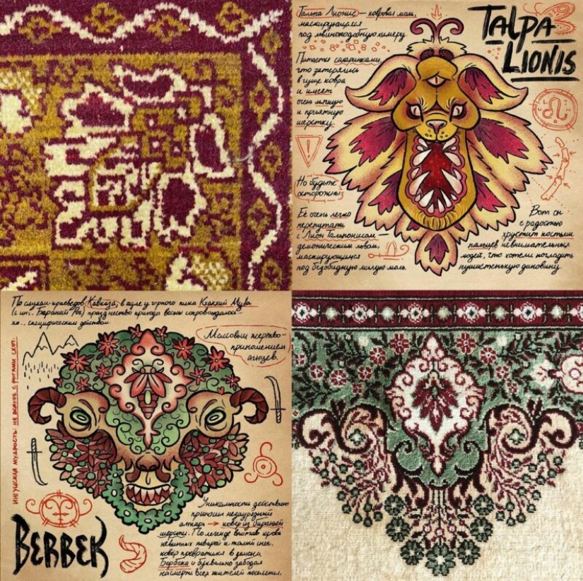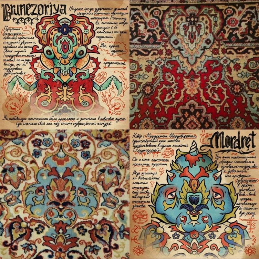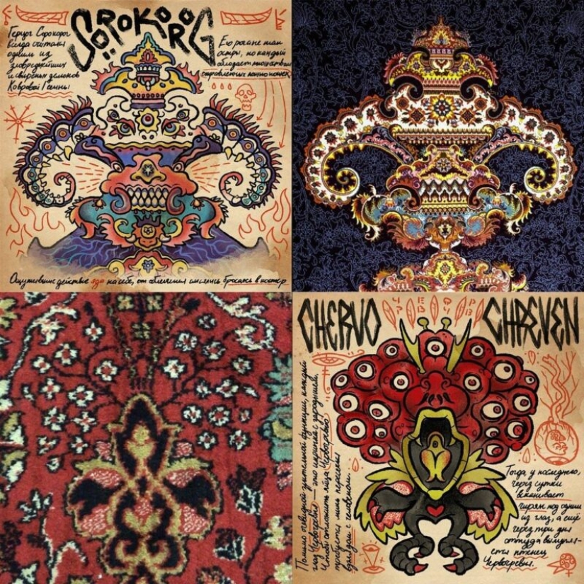 Jan está interesado en las viejas alfombras soviéticas, que todavía se pueden encontrar en las vastas extensiones de los países de la CEI. El artista estudia cuidadosamente los patrones en ellos y encuentra extrañas criaturas y monstruos. Después de eso, solo queda transferirlos al papel, darles un nombre y hacer una descripción.